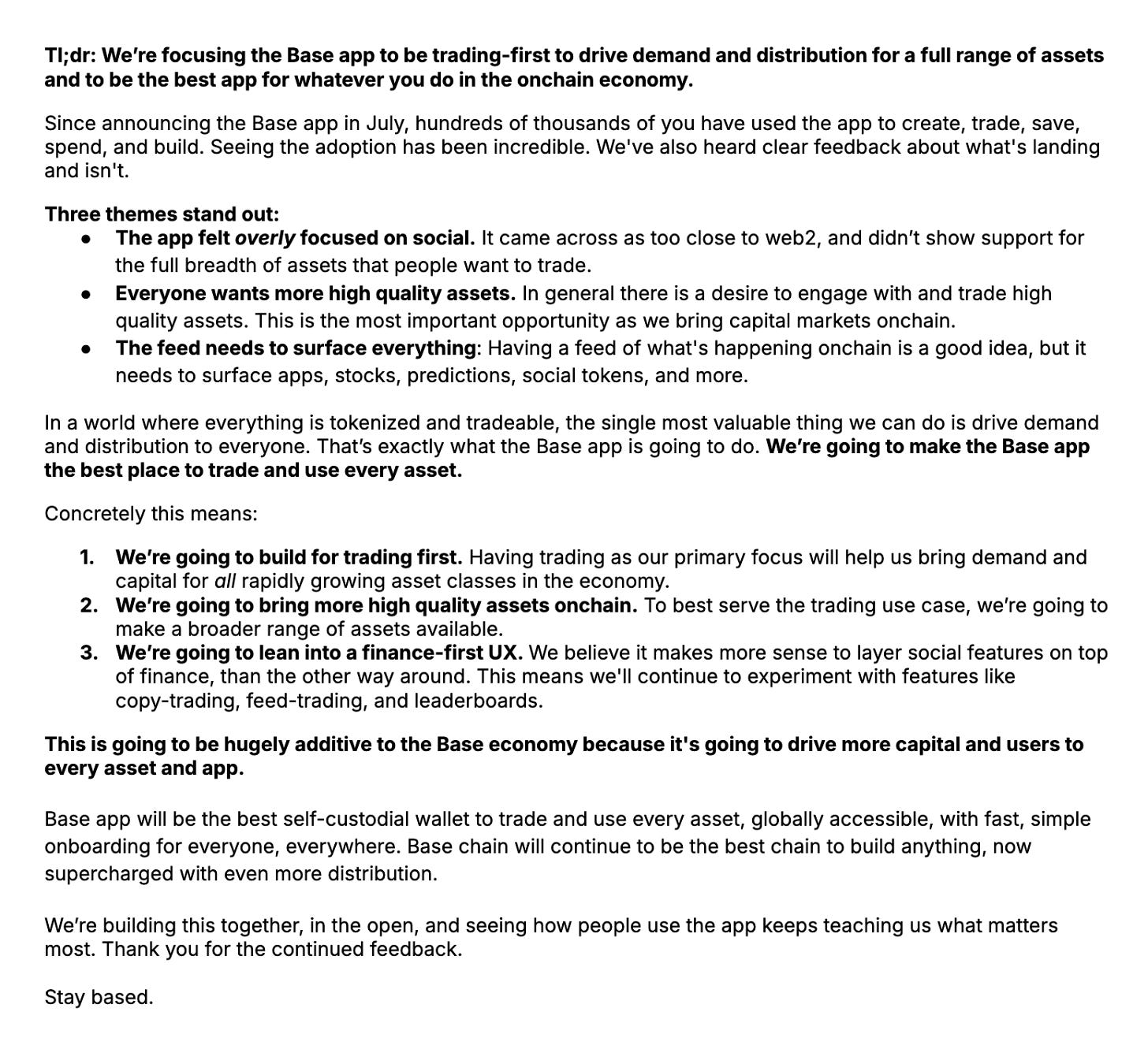 Today, Jesse Pollak announced that The Base App (formerly Coinbase Wallet), which recently embraced social via Farcaster’s decentralized social graph, will pivot further away from social and deeper into all things trading.